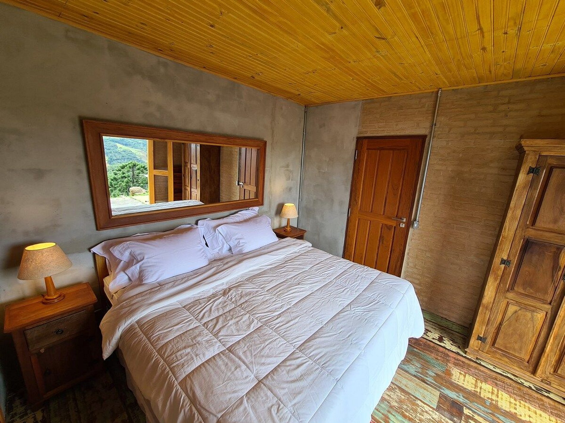 A Casa Pedra acomoda até 4 pessoas. Possui 1 suíte com cama King-Size. Sala de estar com lareira a gás, 1 Sofá cama 2 lugares (podendo ser isolado por cortinas rolo para dormir) e 1 banheiro completo. Cozinha integrada à sala. Roupas de cama de alto padrão Trousseau em algodão egípcio de 400 fios, toalhas de banho Trousseau em algodão egípcio e travesseiros de plumas de ganso. Wi-fi, Banheira de hidromassagem SPA (4 pessoas), fogão a lenha, aquecedor a óleo, Nespresso e adega climatizada.